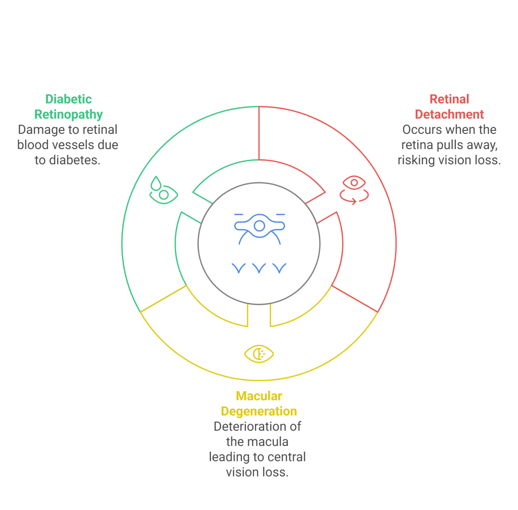 Any damage or disease to the retina can cause vision problems, including blurry vision, loss of central vision, or even blindness.